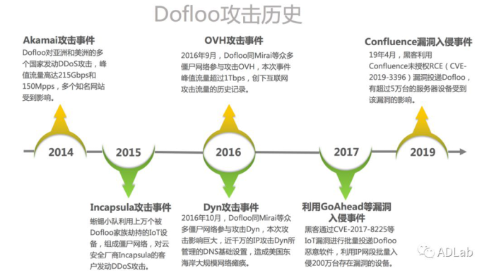 Dofloo,又名Spike和AES.DDoS,是一款支持ARM、x86、mipsd等多CPU架构的僵尸网络程序。Dofloo家族因2014年针对北美洲和亚洲多个国家进行高达215Gbps流量的攻击而出名,此后长期的攻占物联网设备资源并频繁地进行网络攻击活动。根据赛门铁克在2016年发布的《Internet Security Thread Report》,Dofloo僵尸网络恶意程序位列2015年度IoT领域恶意程序威胁排行榜第二名。