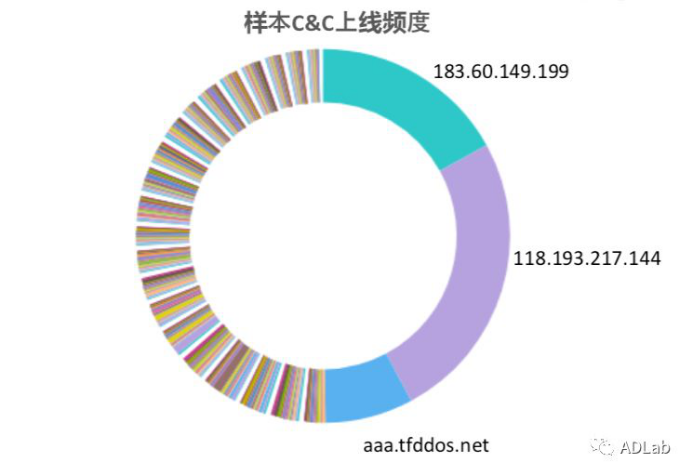 从上图可以看出,有三个地址的上线频度远高于其他的C&C。结合样本分析发现,上线到这三个C&C地址的样本几乎都有两个独立控制的C&C,并且僵尸回连这三个C&C地址都是通过创建子线程的方式进行,而其关联的样本的另外一个C&C却是在主线程中进行回连。因此,通过该僵尸的这几个特性可以断定其中必定存在黑雀攻击的现象,而这三个C&C地址便是Dofloo僵尸生态中的黑雀C&C地址,与黑雀C&C地址相关联的其他C&C地址便是Dofloo僵尸生态中螳螂黑客的C&C地址。