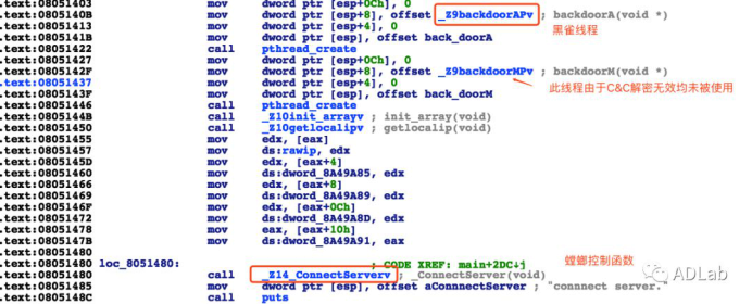 在长期的对僵尸网络的研究中,Dofloo一直是我们监控的对象。在之前的研究中,通过自动化分析该家族的关联样本,发现该家族的大部分样本都会启动两个新的攻击线程,并发现这两个线程存在异常行为。如:不仅会设置延迟启动线程,还会尝试跟另一个C&C控制端进行连接通信。因此,我们对这些样本进行了进一步的分析,最终确定该僵尸生态中被植入了黑雀。