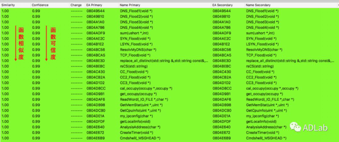 通过对样本的分析,结合样本中的函数命名习惯、攻击流量特征、变种源码注释以及样本爆发传播时用来散播样本的HFS面板语言等特征,我们判定该家族由国内的黑客编写。于是我们溯源目标锁定在国内,通过对黑雀域名“aaa.tfddos.net”中关键信息”tfddos”,我们关联到一款名为“台风DDoS”的僵尸软件。并且通过进一步分析发现,该僵尸软件的模板样本与Dofloo僵尸具有极为相似的行为和网络特性。此外,“台风DDoS”在黑客间活跃的时间同Dofloo爆发时间均在2014年。根据以上一系列的证据证明他们之间存在一定同源性。为了进一步确认他们为同一款僵尸程序,我们还利用bindiff对“台风DDoS”控制端生成的僵尸与Dofloo的样本进行了相似度比对,发现两者代码相似度为100%的代码占比超过98%,因此可以确定“台风DDoS”便是Dofloo家族的一个主控。对比图如下: