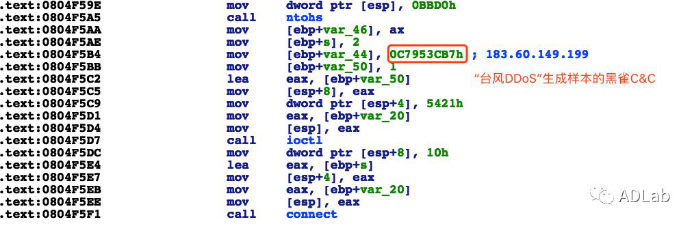 通过对早期的“台风DDoS”的僵尸模板程序分析发现与Dofloo黑雀C&C相同的后门C&C:183.60.149.199。