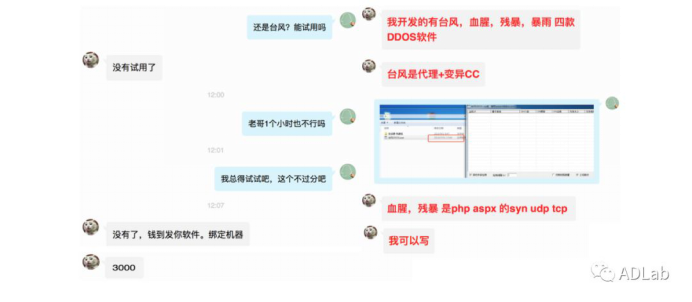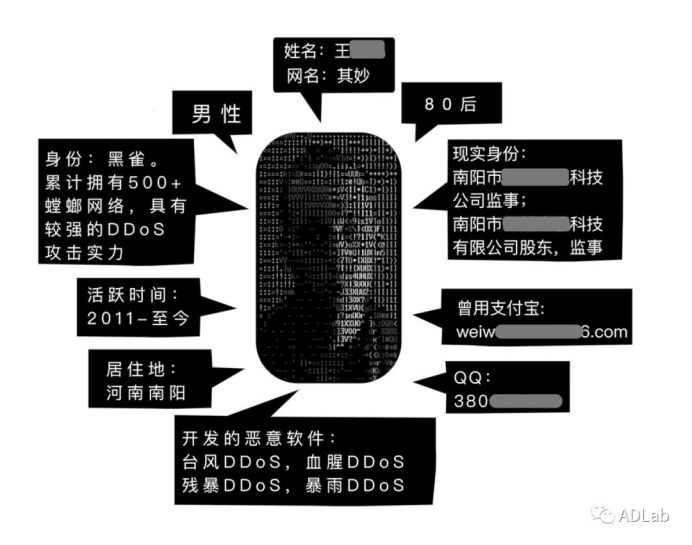 幸运的是我们在“台风DDoS”的售卖历史记录中发现一起欺诈事件,事件中一位购买者披露了贩卖人员的QQ号码和支付宝账号。通过进一步分析,我们最后确认了该贩卖人员的QQ便是“台风DDoS”开发者的事实。此外我们还通过该QQ的关联信息收集到该人员有多年黑产从业历史:如其从2011年开始编写DDoS软件,并创建“台风工作室”;同时其还从事与DDoS相关的黑产业务,并通过贩卖恶意攻击软件和发动DDoS攻击来谋取非法收益。而此黑客便是我要溯源的Dofloo僵尸网络背后的黑雀,其除了开发有“台风DDoS”僵尸软件外,还开发多款DDoS攻击工具如:血腥DDoS、残暴DDoS和暴雨DDoS等。