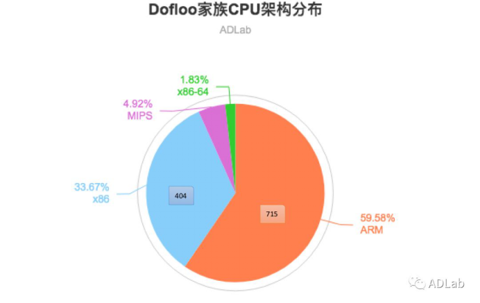 由于Dofloo支持多种CPU架构,我们在对这些平台的样本分析中发现,所有Dofloo支持的架构,都存在黑雀现象。但是僵尸作者对不同的架构的黑雀C&C处理略有不同,这对自动化分析也造成了一定的影响。我们对本次收集的共计1200个样本的架构所占比例进行了统计,绘制成图如下::