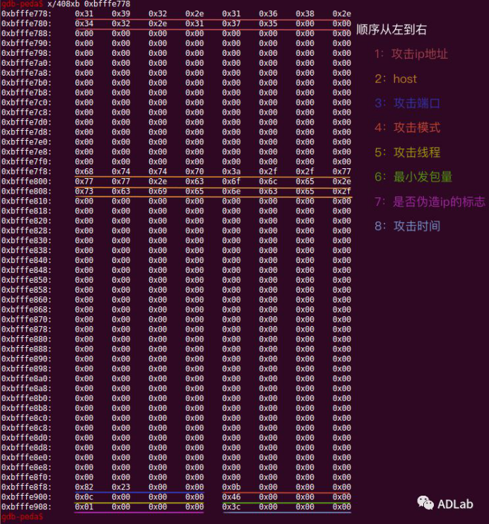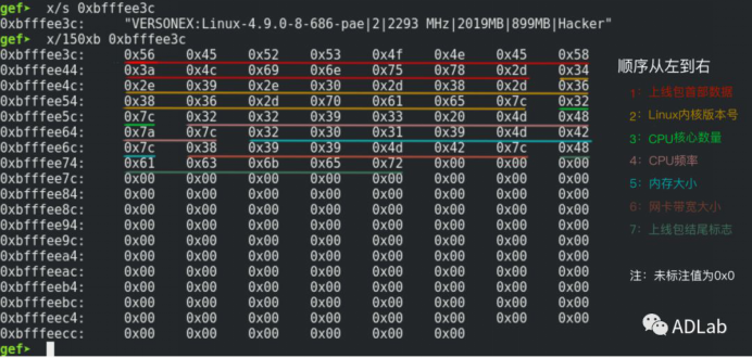 在安装机制设置完毕后,僵尸程序与控制端C&C进行连接。此时恶意程序会收集被入侵设备的系统信息,并把这些信息作为上线包的内容发送到控制端处。这个上线包的内容包含内核版本、CPU频率、总内存大小、网口带宽以及一些硬编码字符串,比如“VERSONEX”和大量样本中出现的“Hacker”。在黑雀的线程中,其上线机制的主体功能与螳螂线程处的功能相似度极高。不同的是,黑雀线程会延迟15小时和40分钟上线,这往往会迷惑分析人员并可能逃避自动化沙箱的检测,使得黑雀C&C隐匿在大量的请求中,减少被发现的可能。通过对大量样本的分析,我们发现上线包的固定大小为0x400字节,并对上线包格式解析、提取后归纳整理出真实的数据结构,其在内存中的分布如下图所示: