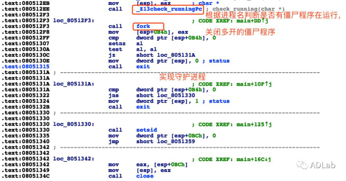 僵尸程序通过对比系统中运行的进程名来确保运行进程的唯一性,并调用fork函数创建守护进程。