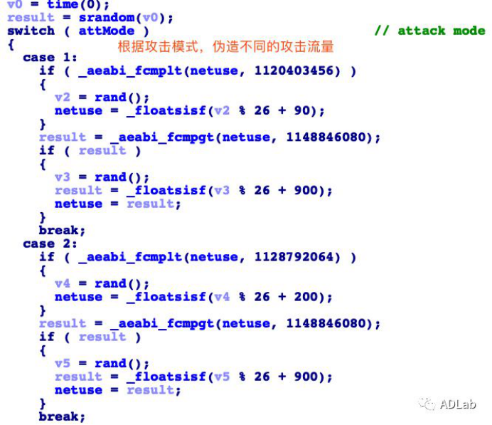 比较有趣的是,下游的黑客在发动DDoS攻击的时候,可能根本不会想到,主控中显示的恶意程序的攻击流量速率几乎都是伪造的。我们在SendInfo线程中发现,当恶意程序执行DDoS攻击时,会调用“fake_net_speed”函数,该函数会根据不同的DDoS攻击的模式,在一个固定的范围内伪造攻击流量速率。下图为对部分计算随机流量的截图: