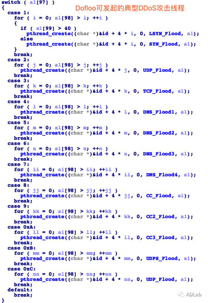 只不过Mr.Black中仅有5种DDoS攻击方式。通过查阅Mr.Black的源码,发现Mr.Black源码中并没有黑雀后门线程和AES加密,没有远控部分,仅能发起DDoS攻击。因此推测Dofloo为参考Mr.Black代码更改后的变种。