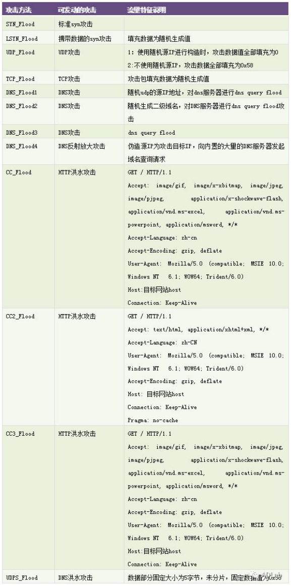 并且我们对Dofloo的攻击方法进行了分析总结,并对部分攻击方法的流量特征进行了提取,制作流量特征表如下: