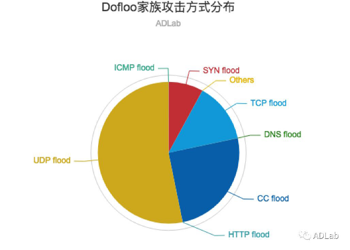 同时根据监控到Dofloo攻击历史,发现该家族主要的攻击方式以UDP Flood 为主,近年来黑客也越来越喜欢DNS和NTP等反射放大攻击手段来对服务器进行打击 ,Dofloo的攻击方式占比也印证了这一点。同时我们也可以看到Layer7层的CC_Flood和Layer4层的TCP_Flood、SYN Flood作为传统的DDoS的攻击方式,其占比也一直较为稳定。并且我们根据相关的情报数据得知,Dofloo的攻击量相对于其他的家族较少,我们分析推测Dofloo每次发动攻击时开启了大量的攻击线程,这样能加大发包量,快速导致目标服务器宕机。