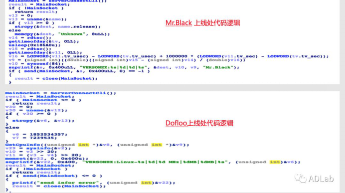 通过对Dofloo僵尸网络进行同源性分析,发现Dofloo僵尸网络家族同Mr.Black僵尸网络家族、Flood.A以及DnsAmp僵尸家族有很高的相似度。首先,我们对Mr.Black家族中的典型样本和Dofloo家族的典型样本进行了对比,发现这两个家族的整体流程和部分代码高度相似,比如下图中的上线机制部分,通过对比可以看到,上线包的内容和格式也极为相似: