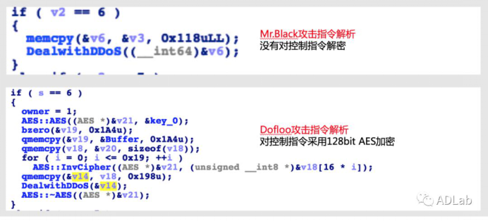 并且还可以看到Mr.Black同样有同名的,发起DDoS攻击的函数DealWithDDoS,其发起攻击的控制指令编码也相同。