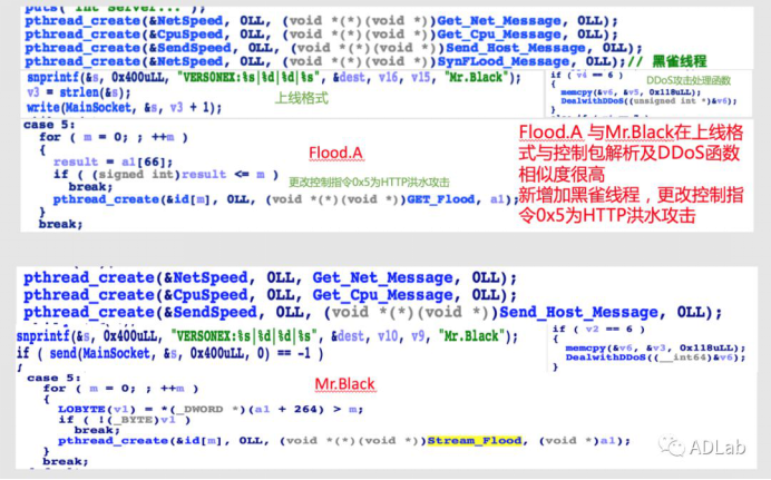 然后通过Flood.A同Mr.Black和Dofloo家族进行对比,发现Flood.A家族较Mr.Black家族新增“SynFLood_Message”黑雀后门线程,“DealwithDDoS”函数中增加Layer7层的HTTP洪水攻击,没有AES加密和远控功能,与Mr.Black家族较为相似,部分对比图如下: