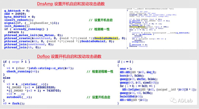 在DnsAmp与Dofloo家族的对比中,我们发现其代码差别较大,但是主要攻击代码以及程序整体设计思路比较相似。在DnsAmp家族中,持久化仍然是通过设置“/etc/rc.d/rc.local”来保持开机自启,并且在启动后同Dofloo一样,会首先确定进程的唯一性。而它的攻击线程“AttackWorker”中,我们发现同Dofloo一样具有同名的攻击函数“DealwithDDoS”,只不过仅有4种攻击方式,分别为udp,icmp,dnsAmp,syn攻击。虽然DnsAmp与Dofloo整体代码相似度不是太高,但是根据其主要攻击代码和程序整体的设计思路,我们推测二者具有关联性,至少DnsAmp为参考Dofloo代码而产生的相似变种。部分对比图如下: