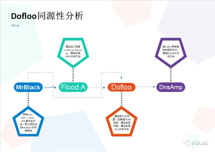 因此,我们大致可以推测出如下的关系:MrBlack可能为原始恶意程序,Flood.A为其变种,主要增加的功能有后门黑雀线程和HTTP洪水攻击;Dofloo可能为Mr.Black或Flood.A的变种,主要新增的特性有程序持久化设置,控制指令AES加密,以及添加多种DDoS攻击方法;推测DnsAmp为Dofloo的变种,它参考了Dofloo的部分代码和设计思路。我们总结其四者的关系图如下: