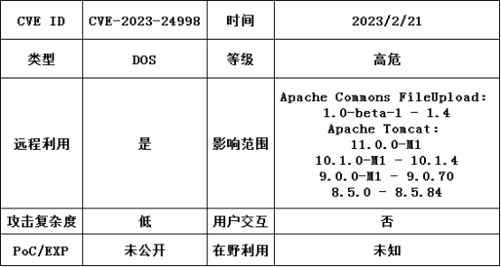 Apache Tomcat官方披露1个存在于Apache Commons FileUpload中的拒绝服务漏洞,其中编号CVE-2023-24998为高危漏洞。启明星辰第一时间对Apache Commons FileUpload官方发布的安全公告进行分析研判,结合泰合盘古平台(THPangu-OS)的底座能力,为广大用户提供应急处置指引方案。