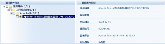 启明星辰资产与脆弱性管理平台实时采集并更新情报信息,对入库资产漏洞Apache Commons FileUpload拒绝服务漏洞(CVE-2023-24998)进行管理,如图所示